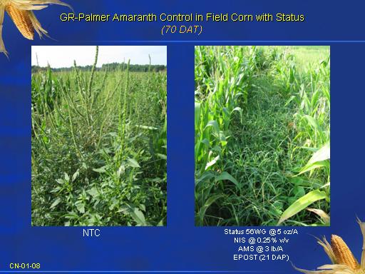 GR-Palmer Amaranth Control in Field Corn with Status (70 DAT)<BR>NTC<BR>Status 56WG @ 5 oz/A <BR>NIS @ 0.25% v/v <BR>AMS @ 3 lb/A <BR>EPOST (21 DAP)<BR>CN-01-08<BR>