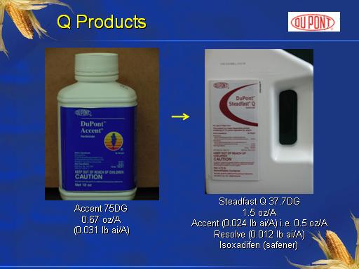 Q Products<BR>Accent 75DG <BR>0.67 oz/A <BR>(0.031 lb ai/A)<BR>Steadfast Q 37.7DG <BR>1.5 oz/A <BR>Accent (0.024 lb ai/A) i.e. 0.5 oz/A <BR>Resolve (0.012 lb ai/A) <BR>Isoxadifen (safener)<BR>
