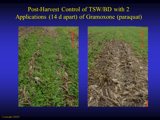 Post-Harvest Control of TSW/BD with 2 Applications (14 d apart) of Gramoxone (paraquat)<BR>1 week after POST2<BR>