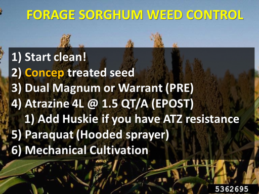 FORAGE SORGHUM WEED CONTROL<BR> Start clean! <BR> Concep treated seed <BR> Dual Magnum or Warrant (PRE) <BR> Atrazine 4L @ 1.5 QT/A (EPOST) <BR> Add Huskie if you have ATZ resistance <BR> Paraquat (Hooded sprayer) <BR> Mechanical Cultivation<BR>