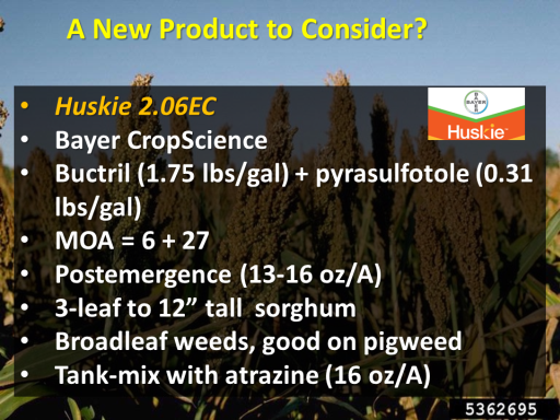 A New Product to Consider?<BR>Huskie 2.06EC <BR>Bayer CropScience <BR>Buctril (1.75 lbs/gal) + pyrasulfotole (0.31 lbs/gal) <BR>MOA = 6 + 27 <BR>Postemergence (13-16 oz/A) <BR>3-leaf to 12” tall  sorghum <BR>Broadleaf weeds, good on pigweed <BR>Tank-mix with atrazine (16 oz/A)<BR>