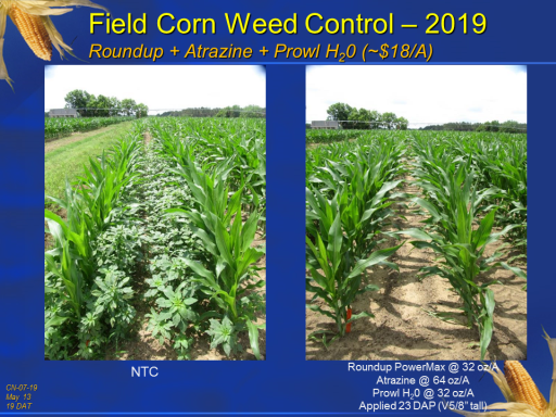 Field Corn Weed Control – 2019 Roundup + Atrazine + Prowl H20 (~$18/A)<BR>CN-07-19 <BR>May 13 <BR>19 DAT<BR>NTC<BR>Roundup PowerMax @ 32 oz/A <BR>Atrazine @ 64 oz/A <BR>Prowl H20 @ 32 oz/A <BR>Applied 23 DAP (V5/8” tall)<BR>
