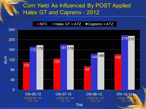 Corn Yield As Influenced By POST Applied Halex GT and Capreno - 2012<BR>LSD (0.10) = 27 <BR>CV = 15<BR>LSD (0.10) = 30 <BR>CV = 16<BR>LSD (0.10) = 30 <BR>CV = 14<BR>LSD (0.10) = 24 <BR>CV = 10<BR>Bu/A<BR>Trial<BR>
