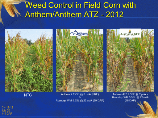 Weed Control in Field Corn with Anthem/Anthem ATZ - 2012<BR>CN-12-12 <BR>July 26 <BR>115 DAP<BR>NTC<BR>Anthem 2.15SE @ 8 oz/A (PRE) <BR>fb <BR>Roundup WM 5.5SL @ 22 oz/A (29 DAP)<BR>Anthem ATZ 4.5SE @ 2 pt/A + <BR>Roundup WM 5.5SL @ 22 oz/A <BR>(18 DAP)<BR>