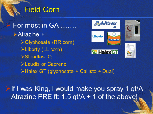 Field Corn<BR> For most in GA ……. <BR>Atrazine + <BR>Glyphosate (RR corn)	 <BR>Liberty (LL corn) <BR>Steadfast Q  <BR>Laudis or Capreno <BR>Halex GT (glyphosate + Callisto + Dual) <BR> <BR>If I was King, I would make you spray 1 qt/A Atrazine PRE fb 1.5 qt/A + 1 of the above! <BR>