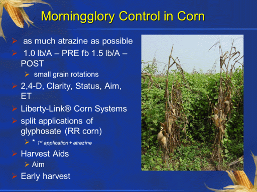 Morningglory Control in Corn<BR> as much atrazine as possible <BR> 1.0 lb/A – PRE fb 1.5 lb/A – POST <BR> small grain rotations <BR>2,4-D, Clarity, Status, Aim, ET <BR>Liberty-Link® Corn Systems <BR>split applications of glyphosate (RR corn) <BR>* 1st application + atrazine <BR>Harvest Aids <BR>Aim <BR>Early harvest		 <BR> <BR> <BR> <BR>