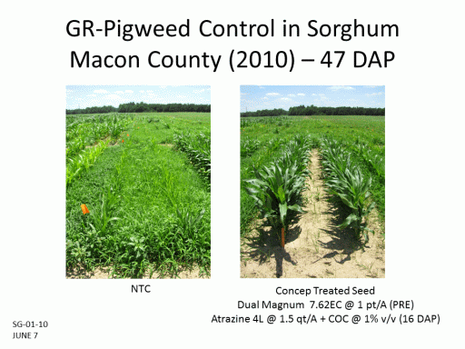 GR-Pigweed Control in Sorghum Macon County (2010) – 47 DAP<BR>NTC<BR>Concep Treated Seed <BR>Dual Magnum  7.62EC @ 1 pt/A (PRE) <BR>Atrazine 4L @ 1.5 qt/A + COC @ 1% v/v (16 DAP)<BR>SG-01-10 <BR>JUNE 7<BR>