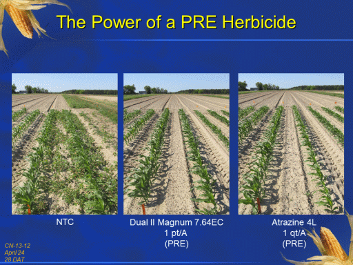 The Power of a PRE Herbicide<BR>CN-13-12 <BR>April 24 <BR>28 DAT<BR>NTC<BR>Dual II Magnum 7.64EC <BR>1 pt/A  <BR>(PRE)<BR>Atrazine 4L <BR>1 qt/A <BR>(PRE)<BR>