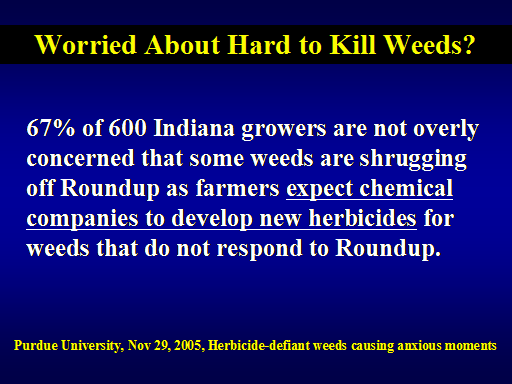 Worried About Hard to Kill Weeds?<BR>67% of 600 Indiana growers are not overly concerned that some weeds are shrugging off Roundup as farmers expect chemical companies to develop new herbicides for weeds that do not respond to Roundup.  <BR>Purdue University, Nov 29, 2005, Herbicide-defiant weeds causing anxious moments <BR>