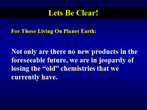 Lets Be Clear!<BR>Not only are there no new products in the foreseeable future, we are in jeopardy of losing the “old” chemistries that we currently have.<BR>For Those Living On Planet Earth:<BR>