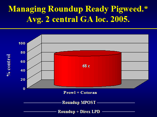 Managing Roundup Ready Pigweed.* Avg. 2 central GA loc. 2005.<BR>% control<BR>Roundup MPOST<BR>68 c<BR>Roundup + Direx LPD<BR>
