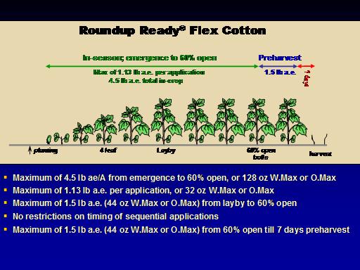 planting<BR>harvest<BR>4 leaf<BR>Layby<BR>60% open bolls<BR>Roundup ReadyŽ Flex Cotton<BR>                     In-season; emergence to 60% open<BR>4.5 lb a.e. total in-crop <BR>Max of 1.13 lb a.e. per application<BR>Maximum of 4.5 lb ae/A from emergence to 60% open, or 128 oz W.Max or O.Max <BR>Maximum of 1.13 lb a.e. per application, or 32 oz W.Max or O.Max <BR>Maximum of 1.5 lb a.e. (44 oz W.Max or O.Max) from layby to 60% open <BR>No restrictions on timing of sequential applications <BR>Maximum of 1.5 lb a.e. (44 oz W.Max or O.Max) from 60% open till 7 days preharvest<BR>1.5 lb a.e.<BR>7 days<BR>Preharvest<BR>