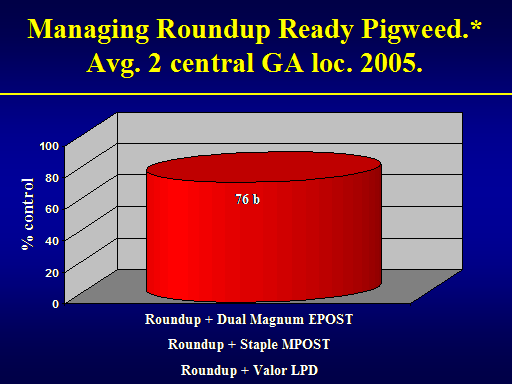 Managing Roundup Ready Pigweed.* Avg. 2 central GA loc. 2005.<BR>% control<BR>76 b<BR>Roundup + Dual Magnum EPOST <BR>Roundup + Staple MPOST <BR>Roundup + Valor LPD<BR>