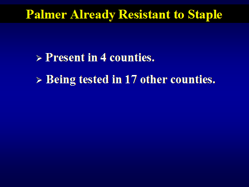 Palmer Already Resistant to Staple<BR> Present in 4 counties. <BR> Being tested in 17 other counties.<BR>