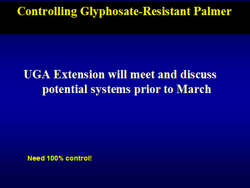 Controlling Glyphosate-Resistant Palmer <BR>UGA Extension will meet and discuss potential systems prior to March <BR>Need 100% control!<BR>