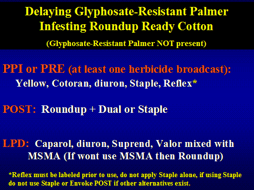 Delaying Glyphosate-Resistant Palmer Infesting Roundup Ready Cotton <BR>(Glyphosate-Resistant Palmer NOT present)<BR>PPI or PRE (at least one herbicide broadcast): <BR>	Yellow, Cotoran, diuron, Staple, Reflex* <BR> <BR>POST:  Roundup + Dual or Staple <BR> <BR>LPD:  Caparol, diuron, Suprend, Valor mixed with 	MSMA (If wont use MSMA then Roundup)<BR>*Reflex must be labeled prior to use, do not apply Staple alone, if using Staple do not use Staple or Envoke POST if other alternatives exist.<BR>