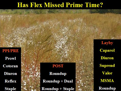 Has Flex Missed Prime Time?<BR>PPI/PRE <BR>Prowl <BR>Cotoran <BR>Diuron <BR>Reflex <BR>Staple<BR>POST <BR>Roundup <BR>Roundup + Dual <BR>Roundup + Staple<BR>Layby <BR>Caparol <BR>Diuron <BR>Suprend <BR>Valor <BR>MSMA <BR>Roundup<BR>