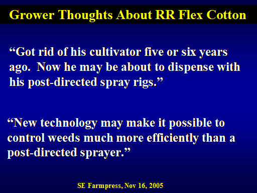 Grower Thoughts About RR Flex Cotton<BR>“Got rid of his cultivator five or six years ago.  Now he may be about to dispense with his post-directed spray rigs.”<BR>“New technology may make it possible to control weeds much more efficiently than a post-directed sprayer.”<BR>SE Farmpress, Nov 16, 2005<BR>