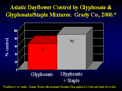 *Dayflower 1 to 5 inches.  Ratings 30 days after treatment. Roundup Ultra applied at 1.5 pt/A and Staple at 0.6 oz/A.  </UL></P>