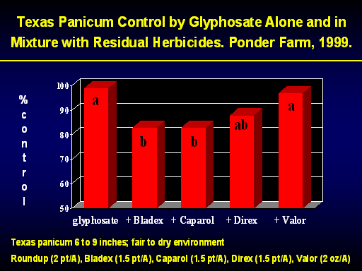 Texas Panicum Control by Glyphosate Alone and in Mixture with Residual Herbicides. Ponder Farm, 1999.</UL></P>