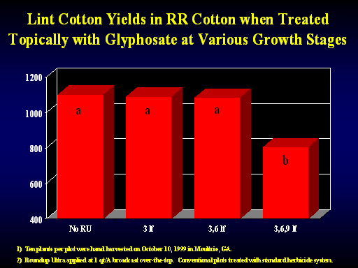 Lint Cotton Yields in RR Cotton when Treated Topically with Glyphosate at Various Growth Stages </UL></P>