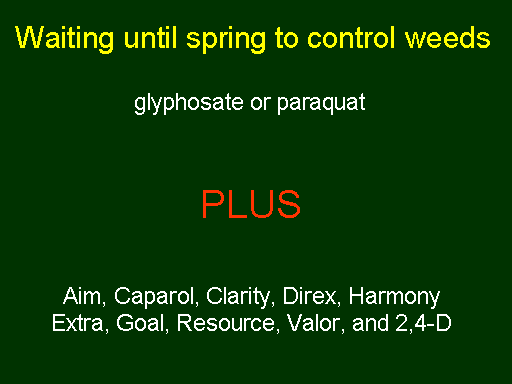 Waiting until spring to control weeds<BR>		glyphosate or paraquat