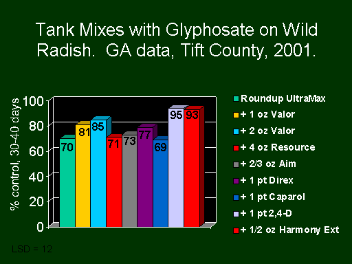 % control, 30-40 days<BR>70<BR>81<BR>71<BR>73<BR>77<BR>69<BR>95<BR>85<BR>Tank Mixes with Glyphosate on Wild Radish.  GA data, Tift County, 2001.<BR>LSD = 12<BR>93<BR>