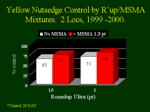 Yellow Nutsedge Control by R’up/MSMA Mixtures.  2 Locs, 1999 -2000.<BR>Roundup Ultra (pt)<BR>*Control 30 DAT.<BR>74<BR>65<BR>80<BR>71<BR>% control<BR>