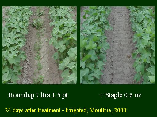 Roundup Ultra 1.5 pt<BR>          + Staple 0.6 oz<BR>24 days after treatment - Irrigated, Moultrie, 2000.<BR>