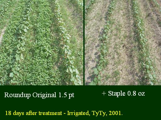 18 days after treatment - Irrigated, TyTy, 2001.<BR>Roundup Original 1.5 pt<BR>          + Staple 0.8 oz<BR>