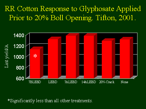 RR Cotton Response to Glyphosate Applied Prior to 20% Boll Opening. Tifton, 2001.<BR>*<BR>*Significantly less than all other treatments.<BR>Lint yield/A<BR>