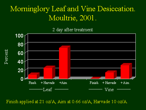 Morninglory Leaf and Vine Desiccation.  Moultrie, 2001.<BR>Percent<BR>2 day after treatment<BR>    Leaf<BR>Vine<BR>Finish applied at 21 oz/A, Aim at 0.66 oz/A, Harvade 10 oz/A.<BR>