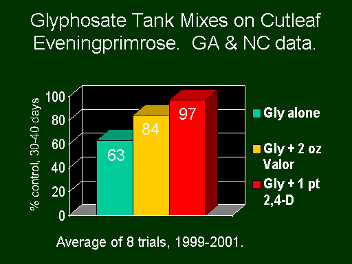 Glyphosate Tank Mixes on Cutleaf Eveningprimrose.  GA & NC data.<BR>% control, 30-40 days<BR>63<BR>97<BR>Average of 8 trials, 1999-2001.<BR>84<BR>