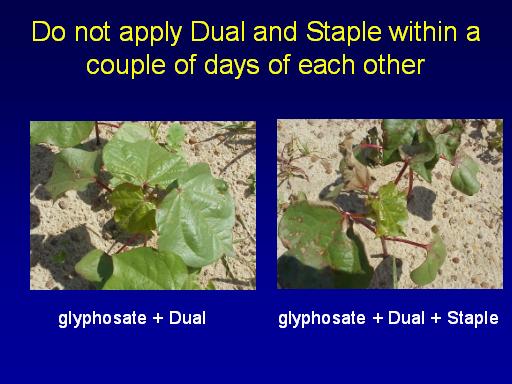 Do not apply Dual and Staple within a couple of days of each other<BR>        glyphosate + Dual		 glyphosate + Dual + Staple<BR>