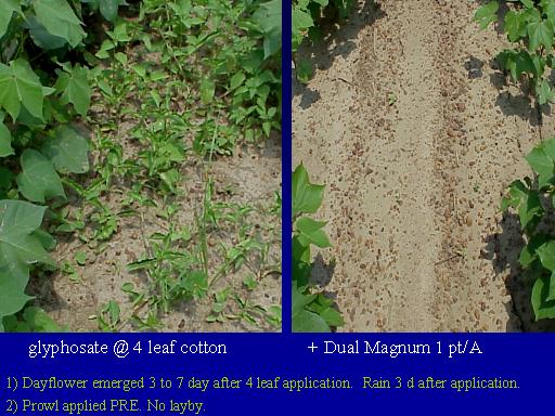 glyphosate @ 4 leaf cotton		      + Dual Magnum 1 pt/A<BR>1) Dayflower emerged 3 to 7 day after 4 leaf application.  Rain 3 d after application.