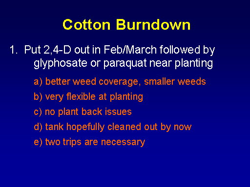 Cotton Burndown<BR>  Put 2,4-D out in Feb/March followed by 	glyphosate or paraquat near planting