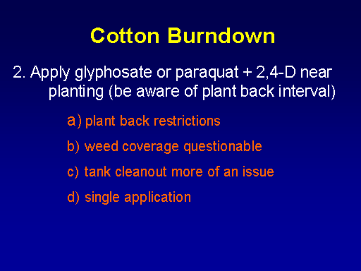 Cotton Burndown<BR> Apply glyphosate or paraquat + 2,4-D near 	planting (be aware of plant back interval)