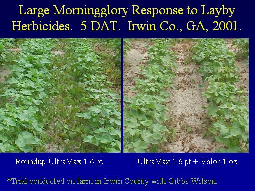 Large Morningglory Response to Layby Herbicides.  5 DAT.  Irwin Co., GA, 2001.<BR>*Trial conducted on farm in Irwin County with Gibbs Wilson.<BR>UltraMax 1.6 pt + Valor 1 oz<BR>Roundup UltraMax 1.6 pt<BR>