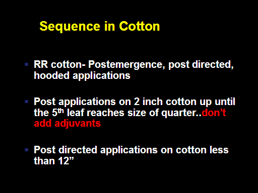 Sequence in Cotton<BR>RR cotton- Postemergence, post directed, hooded applications