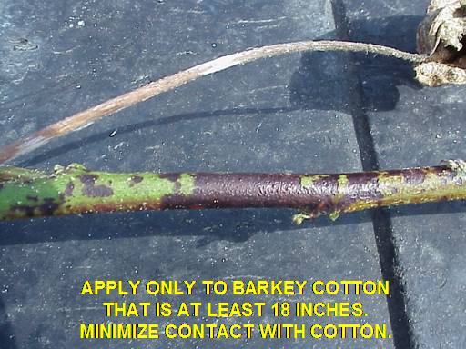 APPLY ONLY TO BARKEY COTTON THAT IS AT LEAST 18 INCHES.  MINIMIZE CONTACT WITH COTTON.<BR>