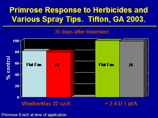 Primrose Response to Herbicides and Various Spray Tips.  Tifton, GA 2003.<BR>% control<BR>35 days after treatment<BR>WeatherMax 22 oz/A<BR>+ 2,4-D 1 pt/A<BR>Primrose 6 inch at time of application.<BR>Flat Fan<BR>Flat Fan<BR>AI<BR>AI<BR>