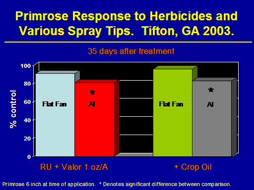 Primrose Response to Herbicides and Various Spray Tips.  Tifton, GA 2003.<BR>% control<BR>35 days after treatment<BR>RU + Valor 1 oz/A<BR>+ Crop Oil<BR>Primrose 6 inch at time of application.  * Denotes significant difference between comparison.<BR>Flat Fan<BR>Flat Fan<BR>AI<BR>AI<BR>*<BR>*<BR>