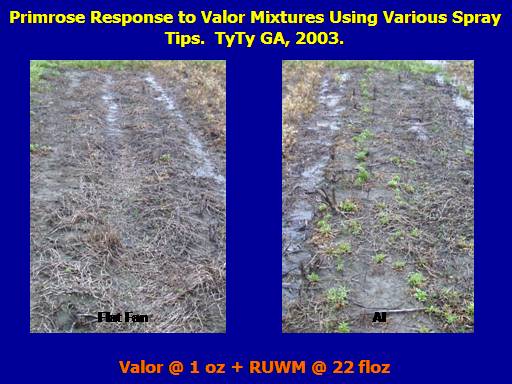 Valor @ 1 oz + RUWM @ 22 floz<BR>Primrose Response to Valor Mixtures Using Various Spray Tips.  TyTy GA, 2003.                                                            <BR>Flat Fan<BR>AI<BR>