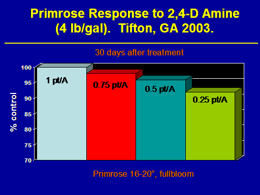 Primrose Response to 2,4-D Amine (4 lb/gal).  Tifton, GA 2003.<BR>% control<BR>30 days after treatment<BR>Primrose 16-20”, fullbloom<BR>1 pt/A<BR>0.75 pt/A<BR>0.5 pt/A<BR>0.25 pt/A<BR>