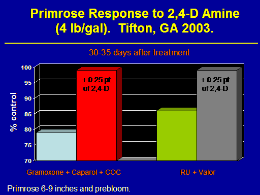 Primrose Response to 2,4-D Amine (4 lb/gal).  Tifton, GA 2003.<BR>% control<BR>30-35 days after treatment<BR>Primrose 6-9 inches and prebloom.<BR>Gramoxone + Caparol + COC<BR>+ 0.25 pt of 2,4-D<BR>+ 0.25 pt of 2,4-D<BR> RU + Valor<BR>