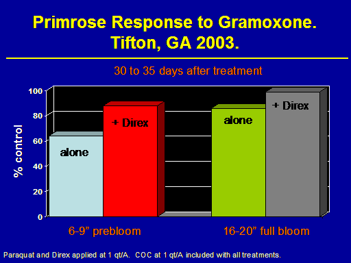 Primrose Response to Gramoxone.  Tifton, GA 2003.<BR>% control<BR>30 to 35 days after treatment<BR>16-20” full bloom<BR>Paraquat and Direx applied at 1 qt/A.  COC at 1 qt/A included with all treatments.<BR>6-9” prebloom<BR>alone<BR>+ Direx<BR>+ Direx<BR>alone<BR>