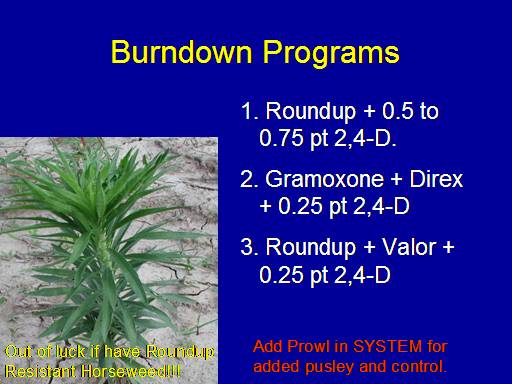 <BR>Out of luck if have Roundup Resistant Horseweed!!!<BR>Add Prowl in SYSTEM for added pusley and control.<BR>