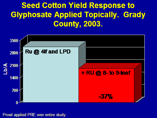 Seed Cotton Yield Response to Glyphosate Applied Topically.  Grady County, 2003.<BR>-37%<BR>Lb/A<BR>Ru @ 4lf and LPD<BR>+ RU @ 8- to 9-leaf<BR>Prowl applied PRE over entire study<BR>