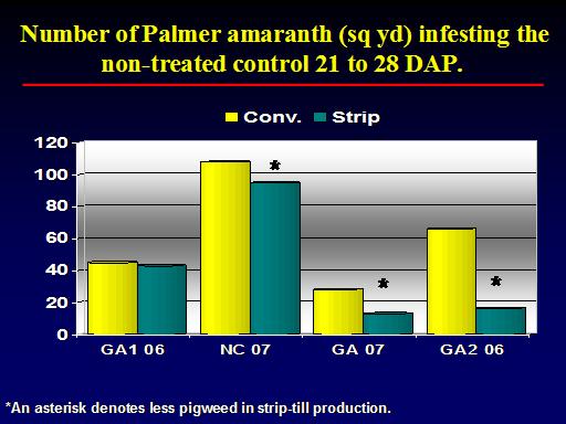 Number of Palmer amaranth (sq yd) infesting the non-treated control 21 to 28 DAP.<BR>*<BR>*<BR>*An asterisk denotes less pigweed in strip-till production.<BR>*<BR>