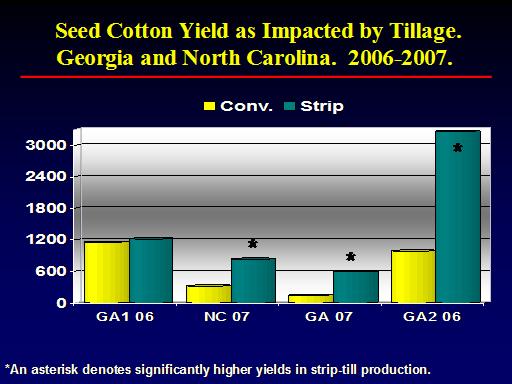 Seed Cotton Yield as Impacted by Tillage.  Georgia and North Carolina.  2006-2007.<BR>*<BR>*<BR>*An asterisk denotes significantly higher yields in strip-till production.<BR>*<BR>